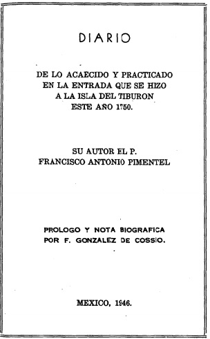 -Pimentel, Francisco Antonio. Diario de los acaecido y practicado en la entrada que hizo a la isla Tiburón este año 1750. Prólogo y nota biográfica F. González de Cossío. Boletín del Archivo General de la Nación. Tomo XVII. Secretaría de Gobernación. México, 1946.